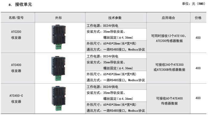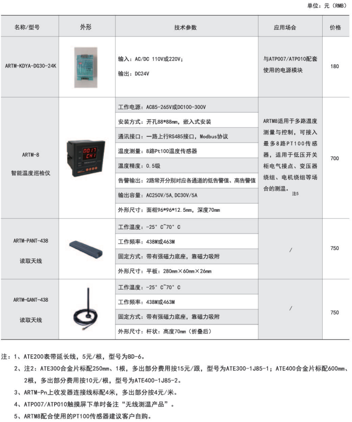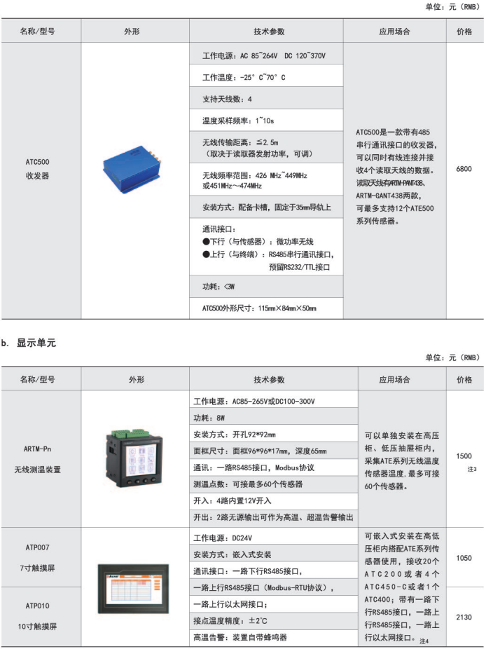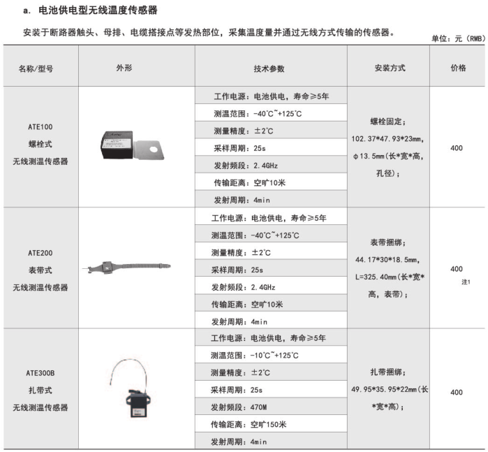 ARTM-Pn無線測溫裝置:ARTM-Pn無線測溫裝置可以單獨安裝在高壓柜、低壓抽屜柜內(nèi),每臺裝置可以接收18個傳感器的數(shù)據(jù),傳感器型號可選配ATE100、ATE200、ATE300。裝置帶有一路485接口,可將采集到的溫度數(shù)據(jù)上傳到監(jiān)控中心。應(yīng)用范圍: