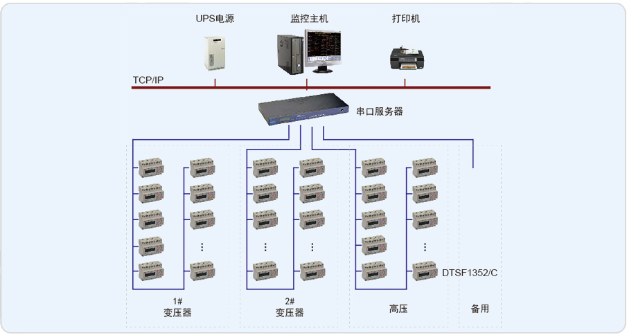 該現場為高壓10kV和0.4KV低壓配電室,共53塊儀表多功能智能儀表( DTSF1352/C),監控值班室位于變電所隔壁,通過組態軟件Acrel-2000實現對現場儀表的實時監測,并記錄歷史數據自動生成報表,以便查詢。為滿足配電室統一監控的要求,配電現場安裝的安科瑞公司網絡電力儀表通過屏蔽雙絞線手拉手式相連至后臺主機內的工業串口卡,實現對現場數據的采集,存儲,處理,實時顯示以及歷史查詢。