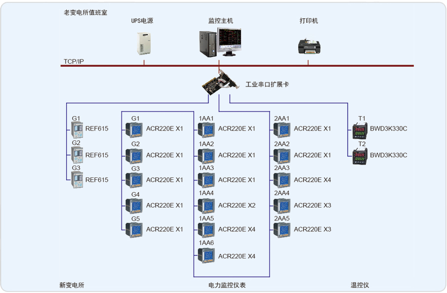 安科瑞電氣股份有限公司于2011年8月承接了蘇州軸承廠有限公司電力監(jiān)控系統(tǒng)的設計與實施。本監(jiān)控系統(tǒng)主要實現(xiàn)蘇州軸承廠有限公司的10/0.4kV配電系統(tǒng)進行用電監(jiān)測與電能管理;監(jiān)測范圍為新建變電所的T1、T2變壓器進線柜,聯(lián)絡柜,溫控儀,高壓側儀表及綜保進行遠程實時監(jiān)控和電能管理。該系統(tǒng)總計有31只儀表(其中包括26只ACR220E,3只ABB,2只溫控儀),分3條總線,都是直接通過屏蔽雙絞線走管道拉至值班室連接到主機擴展卡上,實現(xiàn)總線上儀表與監(jiān)控主機的數(shù)據(jù)連通。
