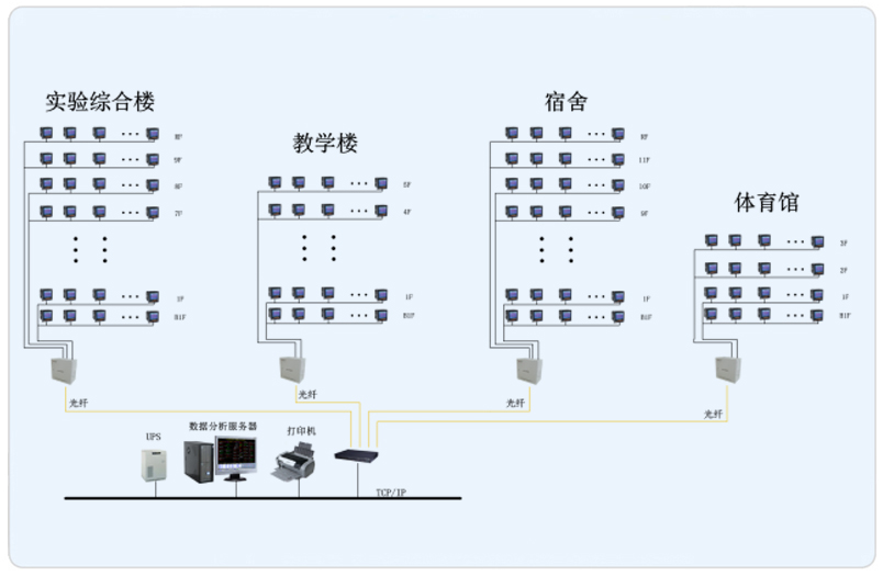 安科瑞Acrel-5000建筑能耗分析管理系統(tǒng)根據(jù)上海復(fù)旦中學(xué)西部校區(qū)現(xiàn)場(chǎng)實(shí)際情況,整體網(wǎng)絡(luò)結(jié)構(gòu)采用屏蔽雙絞線直接接至樓層弱電井的數(shù)據(jù)采集器然后通過(guò)光纖將數(shù)據(jù)上傳至的監(jiān)控主機(jī)。該系統(tǒng)主要采用分層分布式計(jì)算機(jī)網(wǎng)絡(luò)結(jié)構(gòu),站控管理層、網(wǎng)絡(luò)通訊層和現(xiàn)場(chǎng)設(shè)備層。