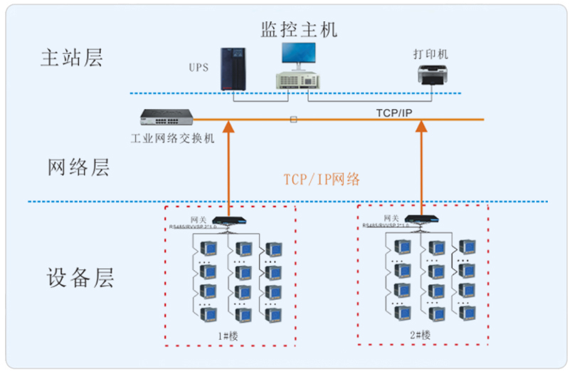 系統(tǒng)采用Acrel-5000能耗管理系統(tǒng),該系統(tǒng)主要采用分層分布式計算機網(wǎng)絡(luò)結(jié)構(gòu),如系統(tǒng)結(jié)構(gòu):站控管理層、網(wǎng)絡(luò)通訊層和現(xiàn)場設(shè)備層。其中上海環(huán)境監(jiān)測中心項目現(xiàn)場設(shè)備分布為1#樓及2#樓,該所有監(jiān)測點都在樓層強電井的配電箱內(nèi),所有儀表通過485屏蔽雙絞線鋪設(shè)至值班室,經(jīng)采集器至系統(tǒng)主機從而完成儀表數(shù)據(jù)的采集并管理。